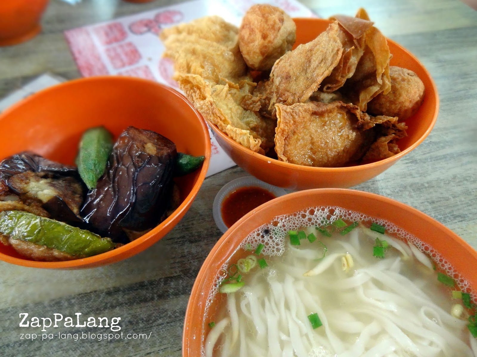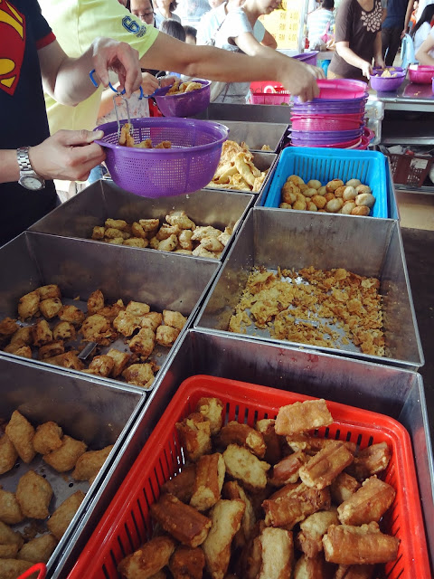 找到位子之后,我们立刻冲到卖炸酿料的档口,小小的档口摆放着炸好的酿料,让顾客自行挑选后再配上粉面,这就是所谓的炸料粉啦!