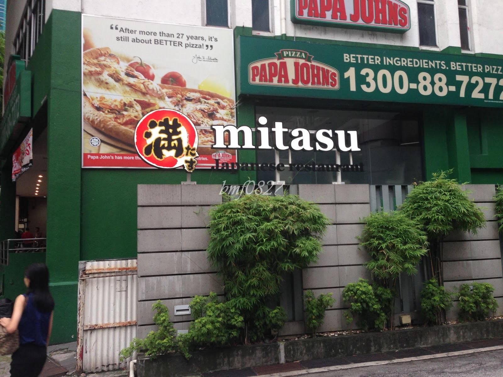 由于马路还在维修当中,所以我们就约好在 Farenheit 对面的酒店见面(Farenheit 工作时间之后泊车是统一收费)。我们就在那间酒店的横巷穿过后,沿路走去,然后转右再走就抵达 Central Plaza了。映入眼帘的就是大大的 Papa John 招牌,下面就是 Mitasu 了。Mitasu 就座落在 Central Plaza 的地底层。