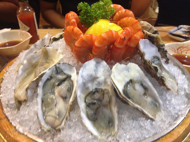 重头戏来了!!!期待已久的生蚝就在眼前,而且摆设的方式何其壮观。生蚝非常的新鲜,送到桌上式还是冷的。可是让我小小失望的是,生蚝的肉很薄,无法让我一口豪迈地咬下去。虾子很甜,欧巴剥给我让甜味更上一层楼。