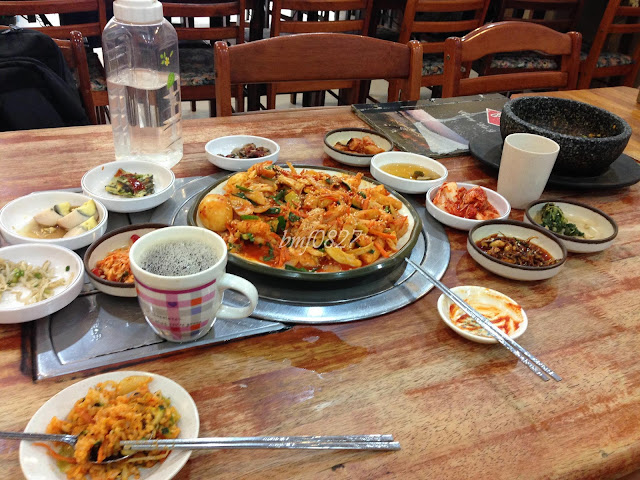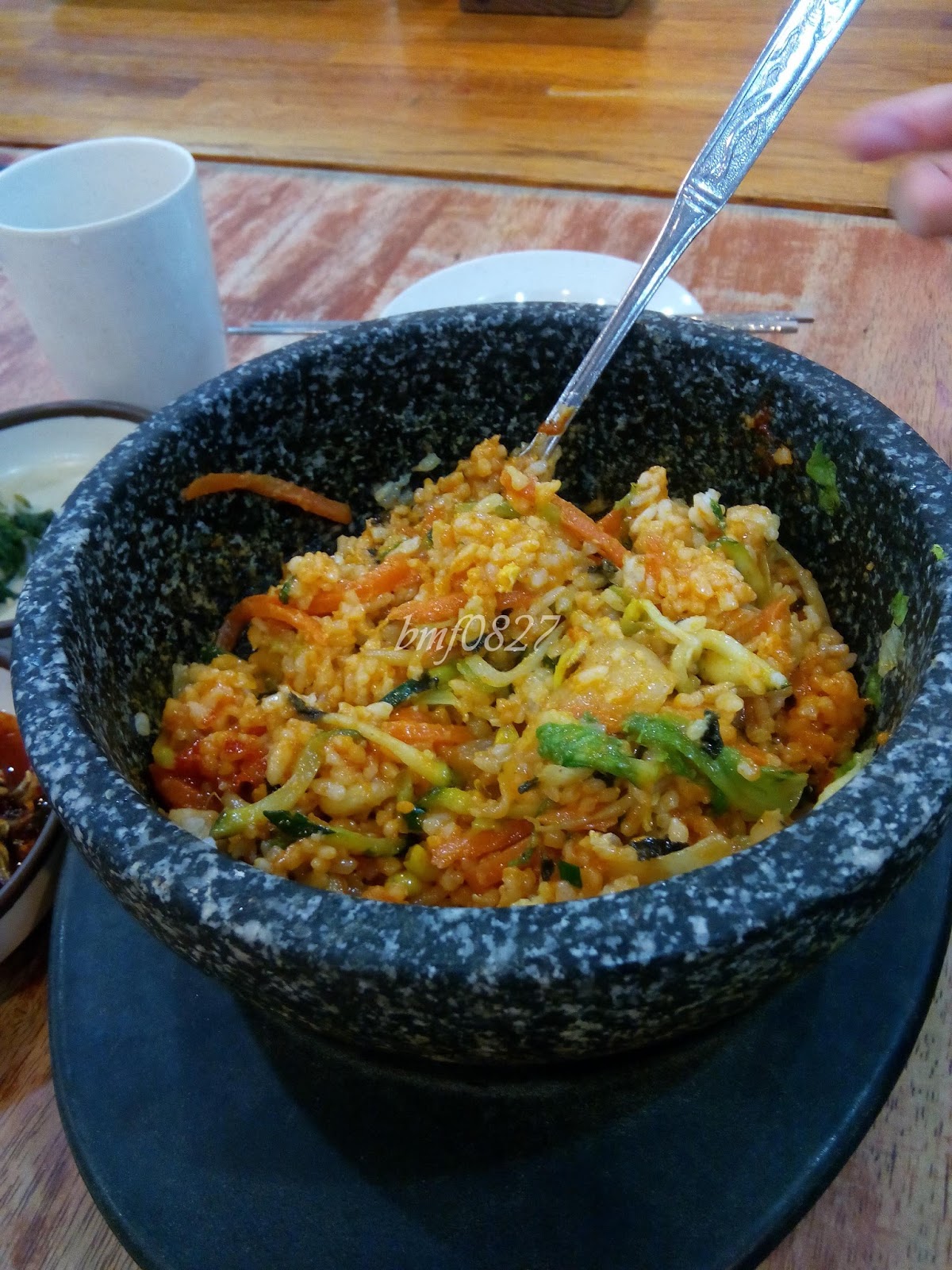 我们点了一个石头拌饭。里头有一半都是饭,再伴以不同的蔬菜。我们加入附上的酱,搅拌均匀后,颜色鲜艳,非常地诱人。每一颗米饭都被酱料包围着,而且在加热后的石头碗里被慢慢地升温。每一口都夹杂不同的蔬菜和辣酱,幸福满满。辣酱不会太辣,反而是刺激食欲的那种。