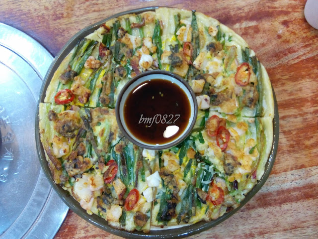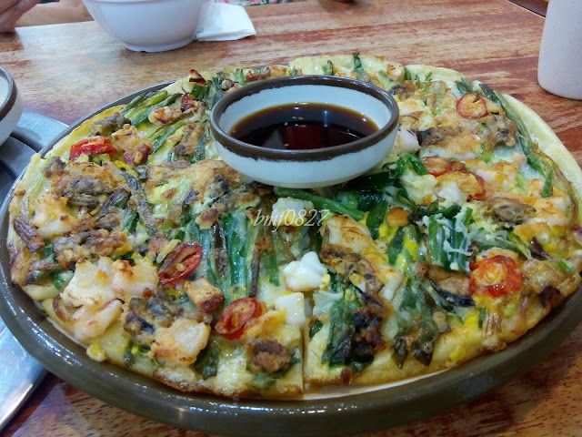 我们还点了海鲜煎饼 (Pajeon)。 一端上桌时,我们都被它惊人的大分量给吓倒了。 厚厚的 Pajeon 上面铺满了青葱,韭菜,章鱼和辣椒片,让人很有饱足感。 特制的酱料提升了 Pajeon 的整体味道,是一道很好的 comfort food。