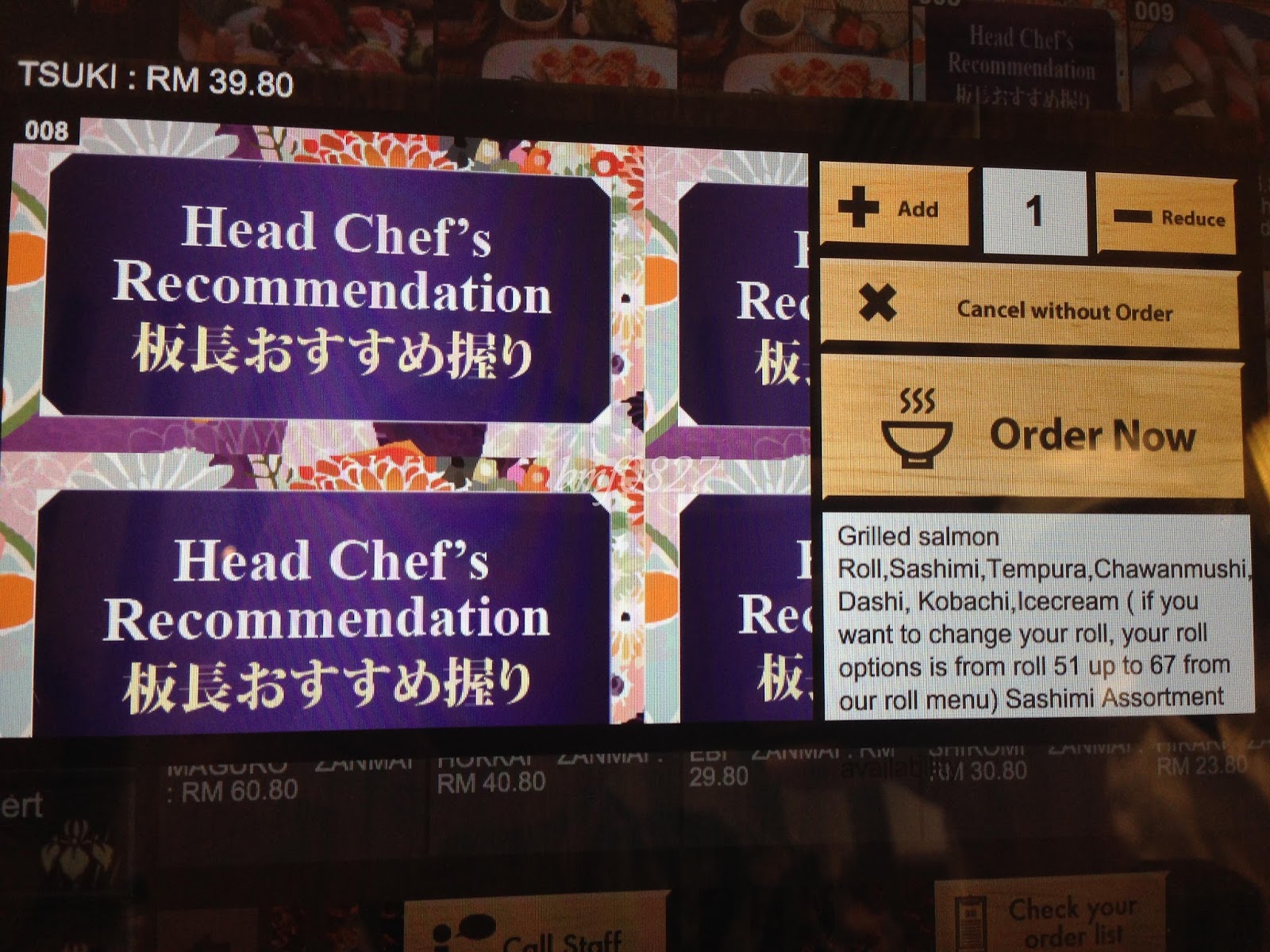 这里是使用iPad点餐的,非常先进。 不知道要点什么的情况之下,就点了Head Chef's Recommendation (Omakase)。 他们的 Omakase 包括了一个 味噌湯 、Maki、生鱼片、天妇罗和雪糕各一份。