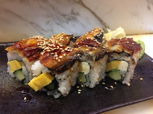 Unagi Maki 也是非常好吃。 虽然有了 Cream cheese 不是每个人都能接受,欧巴却一直不断在那里 Oishi (好吃)。 Unagi Maki 里的甜蛋配上 Cream cheese,味道真的很不一样,值得一试。