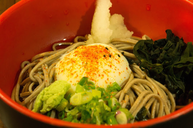 最后,由于受到菜单里面上的温泉蛋所吸引,所以我们又点了一碗冷的 Onsen Tamago Soba。 店家所呈现的 Onsen Tamago Soba 非常的吸引人,煮得刚好够熟的温泉蛋上撒了一些 Chili Flakes 和黑芝麻,为这道面增添了一些色彩。 Onsen Tamago Soba 的配料让人惊喜! 有萝卜泥,海苔,切得漂亮的青葱和让人惊艳的山葵 (Wasabi)。 是不是很特别呢,本人从来没吃过面里拌有山葵,这家是第一次! 我们把温泉蛋,配料和荞麦面混合在一起吃,味道出乎意料的好! 一入口,面带有很香浓的山葵味道但是吃起来并不觉得辣。 唯一美中不足的是,店家没有把荞麦面的水滤乾净,导致碗底还有一些水,把蛋搅下去后就变得水水的,吃不太到蛋的味道了。