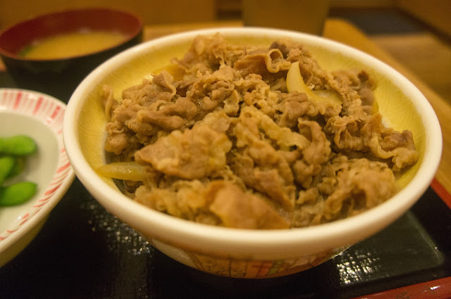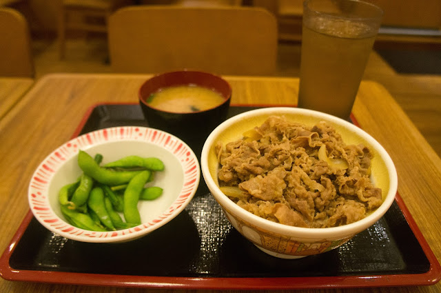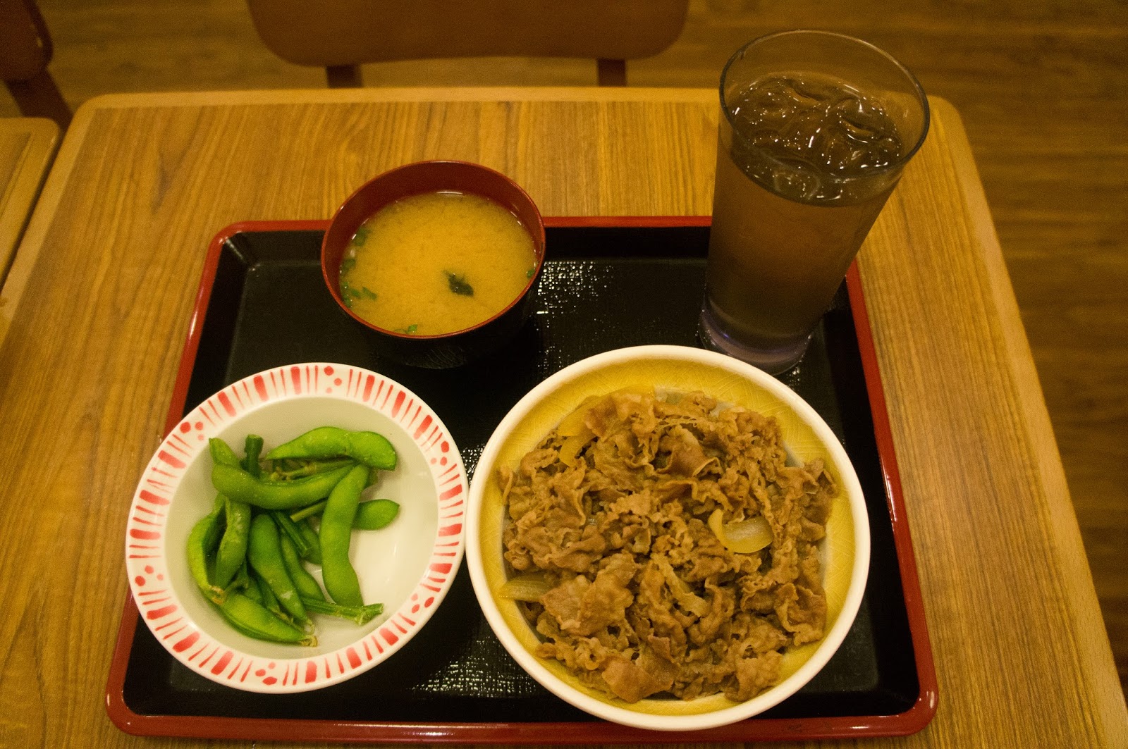 我们为牛丼加了配料,成为了完整的套餐。 毛豆给的有点少,味噌汤也颇咸。 感觉上套餐的准备有点不太用心,让我觉得颇失望。