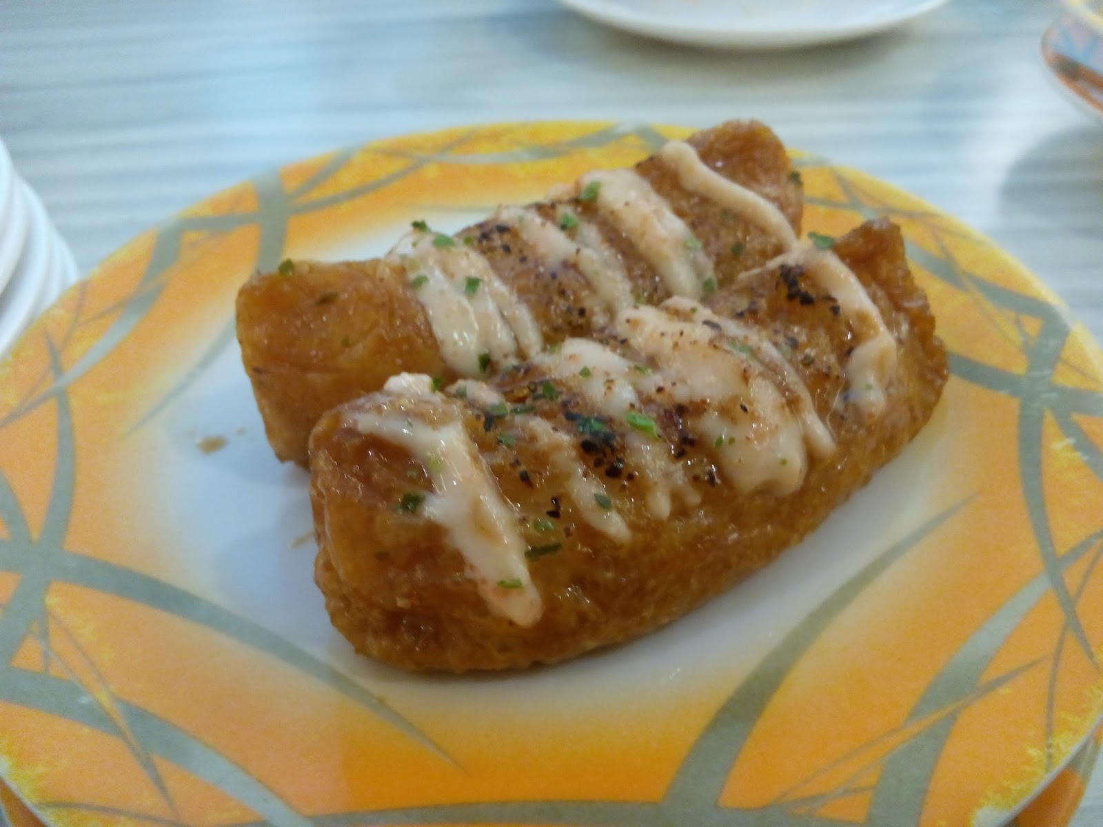 带甜的腐皮里头包着寿司饭团,上面淋上了明太酱,甜甜咸咸的蛮开胃。