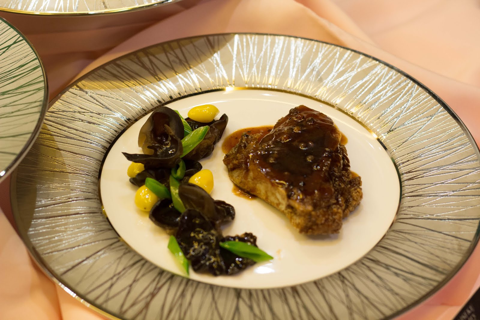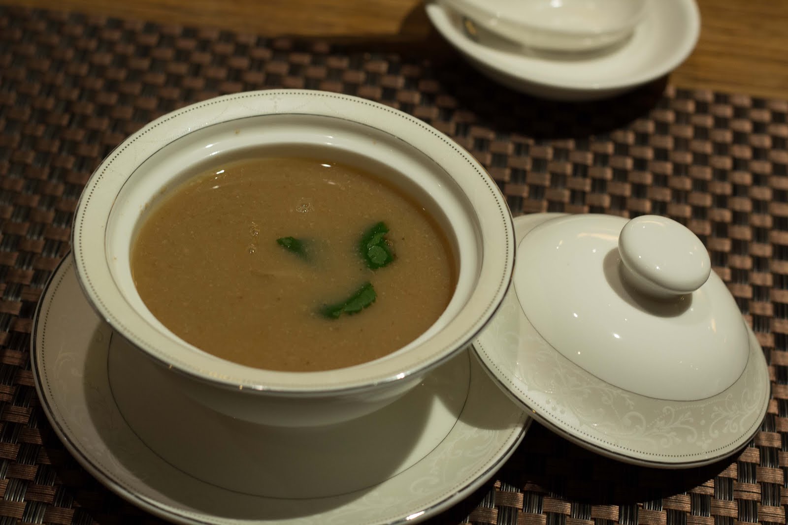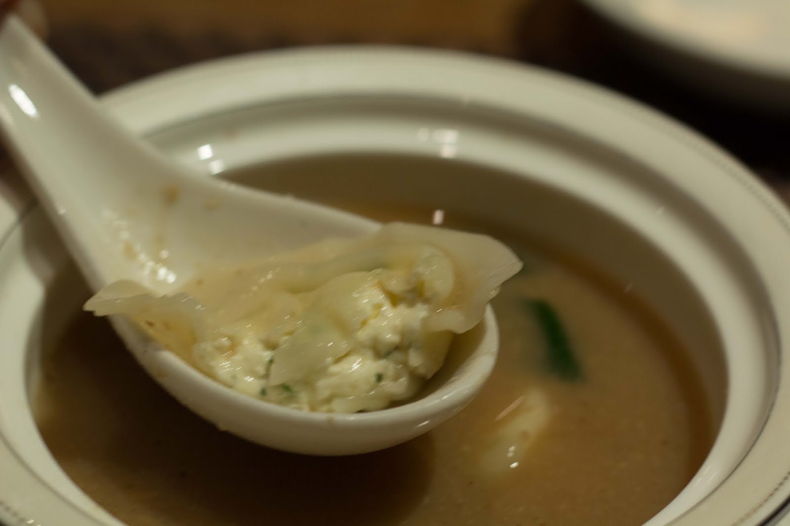 再来的是,Wild Mushroom Soup with Cheese Dumpling。原本以为这道汤会有点类似西式的蘑菇浓汤般黏稠,但出乎意料地是这道汤和西式浓汤完全不一样。汤的稠度很稀,比较像清汤一样,但整碗汤充满野菇的香味。这道汤也不像西式般的浓郁,比较清淡,给人一种清新感。汤的温度把包在皮里的芝士加热,形成了半固体状态的芝士,更加诱人。这里所选用的芝士不像一般吃到的那样浓郁,味道比较温和,口感上比较软,带点微酸,但搭配上蘑菇汤却很适合,是一种全新的味觉体验。