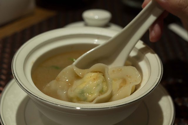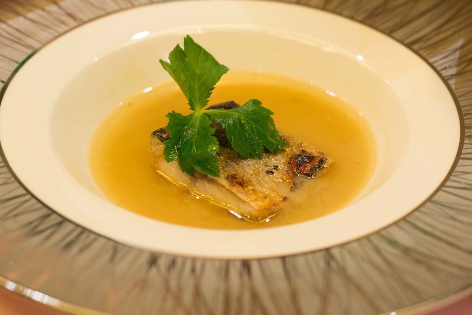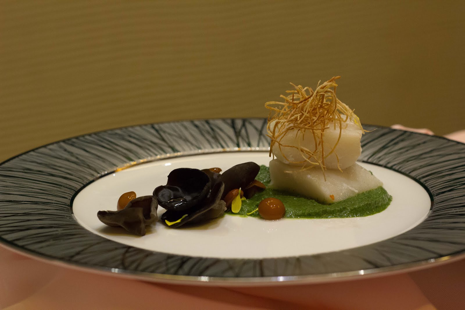 再来的是,Wild Mushroom Soup with Cheese Dumpling。原本以为这道汤会有点类似西式的蘑菇浓汤般黏稠,但出乎意料地是这道汤和西式浓汤完全不一样。汤的稠度很稀,比较像清汤一样,但整碗汤充满野菇的香味。这道汤也不像西式般的浓郁,比较清淡,给人一种清新感。汤的温度把包在皮里的芝士加热,形成了半固体状态的芝士,更加诱人。这里所选用的芝士不像一般吃到的那样浓郁,味道比较温和,口感上比较软,带点微酸,但搭配上蘑菇汤却很适合,是一种全新的味觉体验。