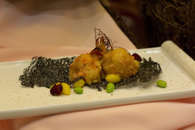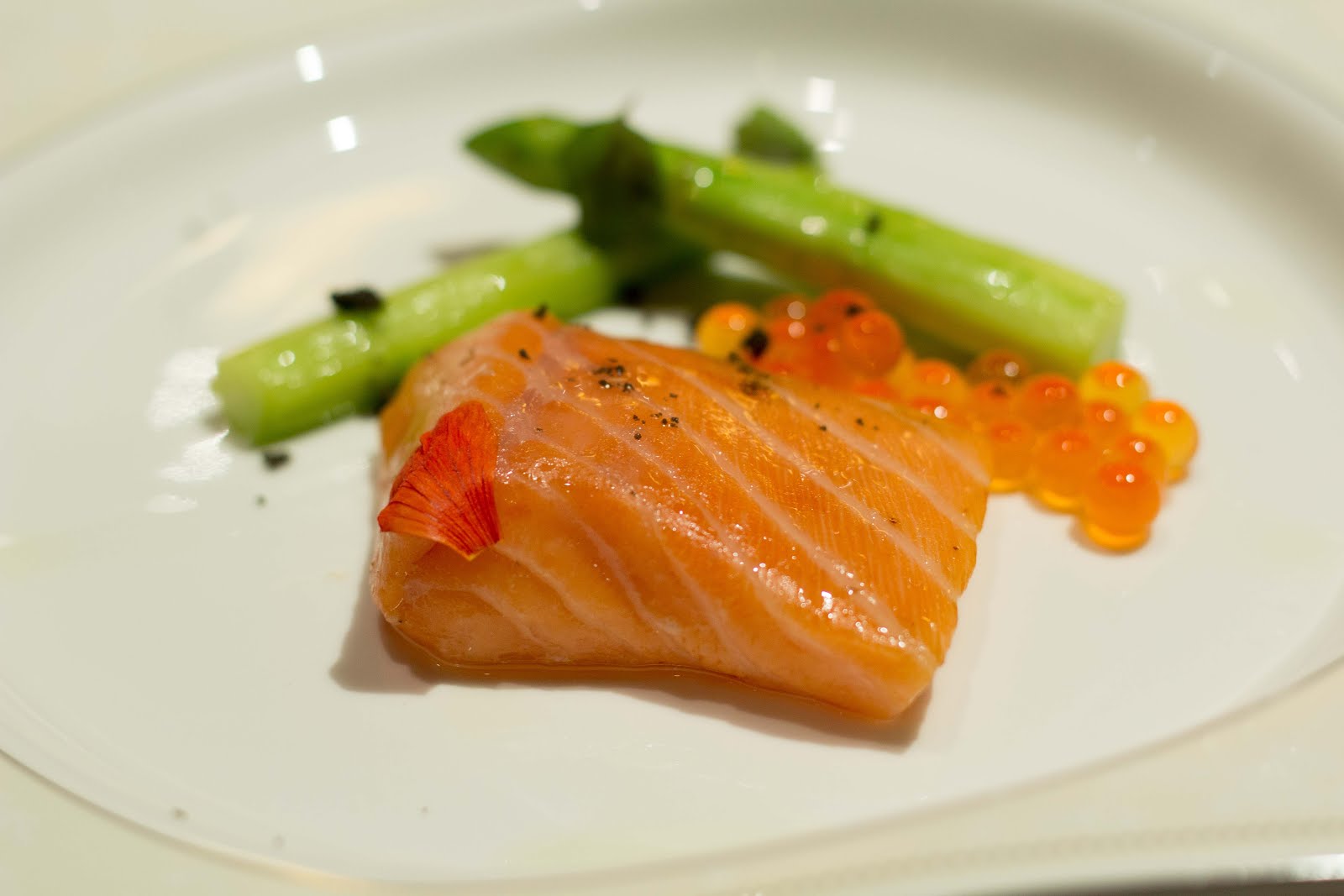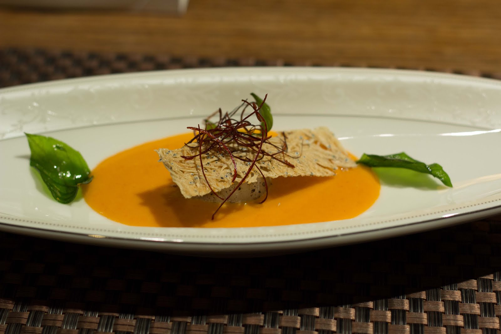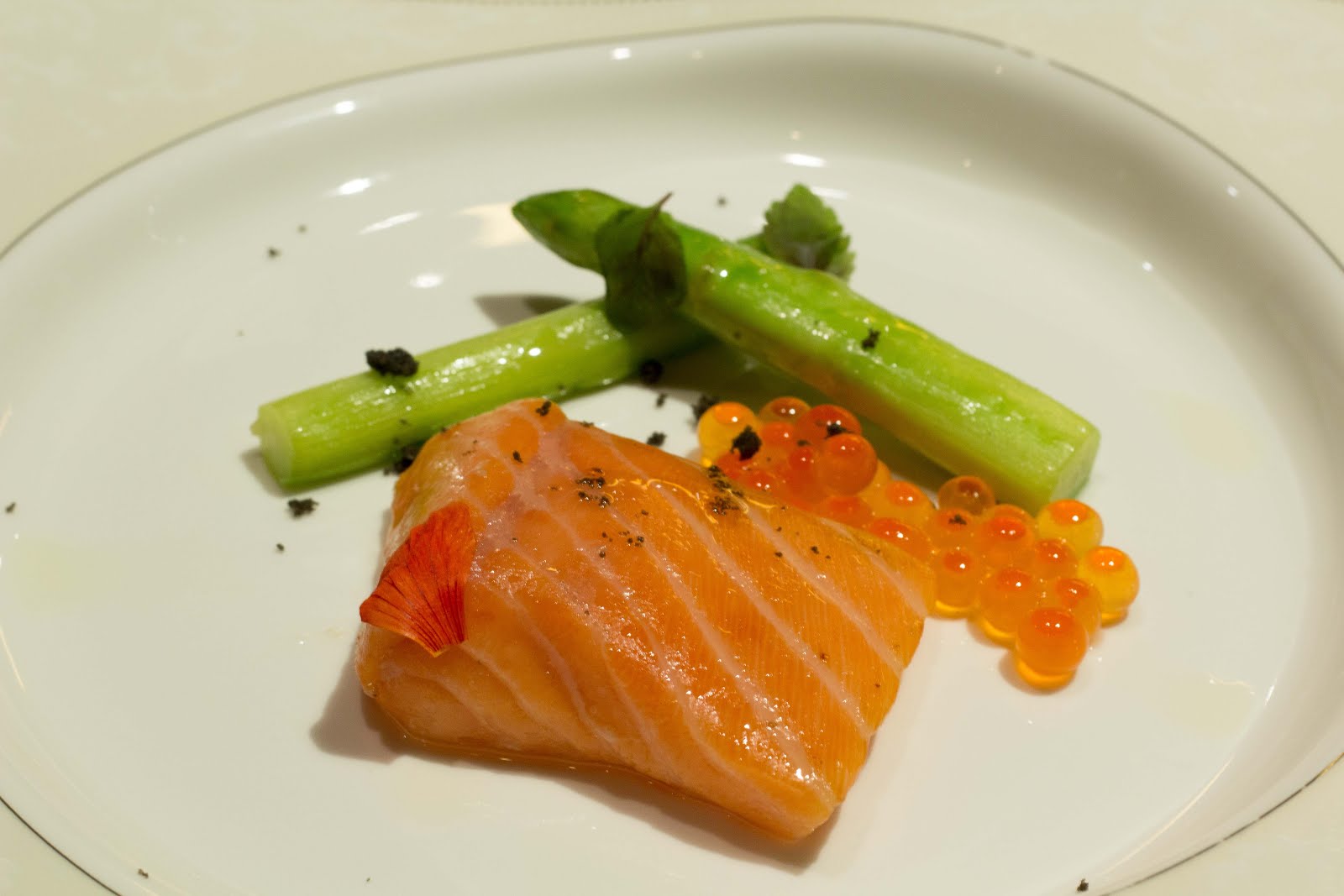接着登场的是色彩欢愉的 Poached Masu with Smoked Apple Wood Chips。相信 Poached Egg 就比较常听到,Poached Masu 还是头一回。通常,鳟鱼在日本料理都是做刺身较多。可是,这里的厨师利用了Poach,意指水煮法。这样的煮法不但保留了鳟鱼原有的口感,而且还可令不喜欢生食的顾客接受。整个鳟鱼的口感很滑,而且带有smoked的味道,很是独特。最让我惊艳的是,Poached 鳟鱼的整体结构很软,用筷子稍微夹就断开,可是却不会散掉。一般上提到smoked 让我联想到的就是很咸,因为通常我们吃到的 smoked salmon 都是比较咸的,但这里的 Poached Masu 味道较淡,所以搭配上一旁的鲑鱼卵,就很好地赋予较丰富的味道。