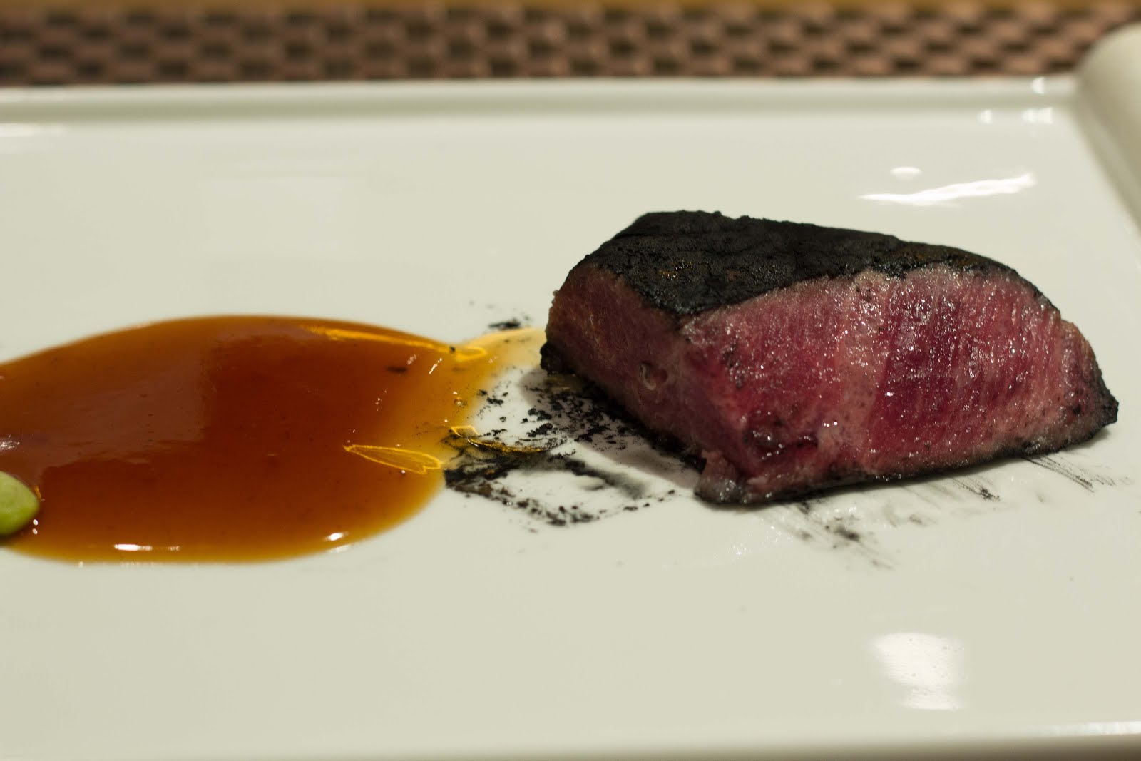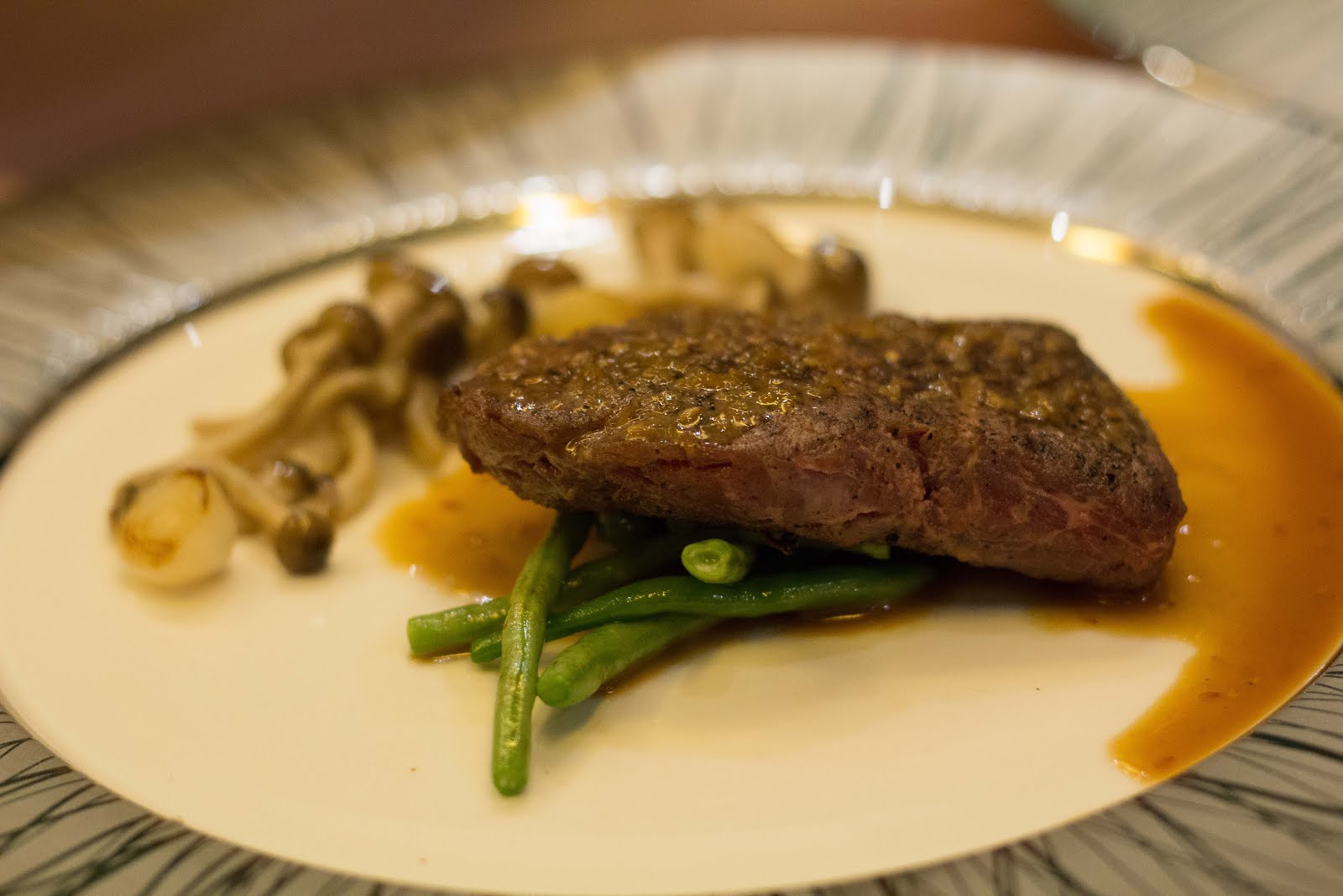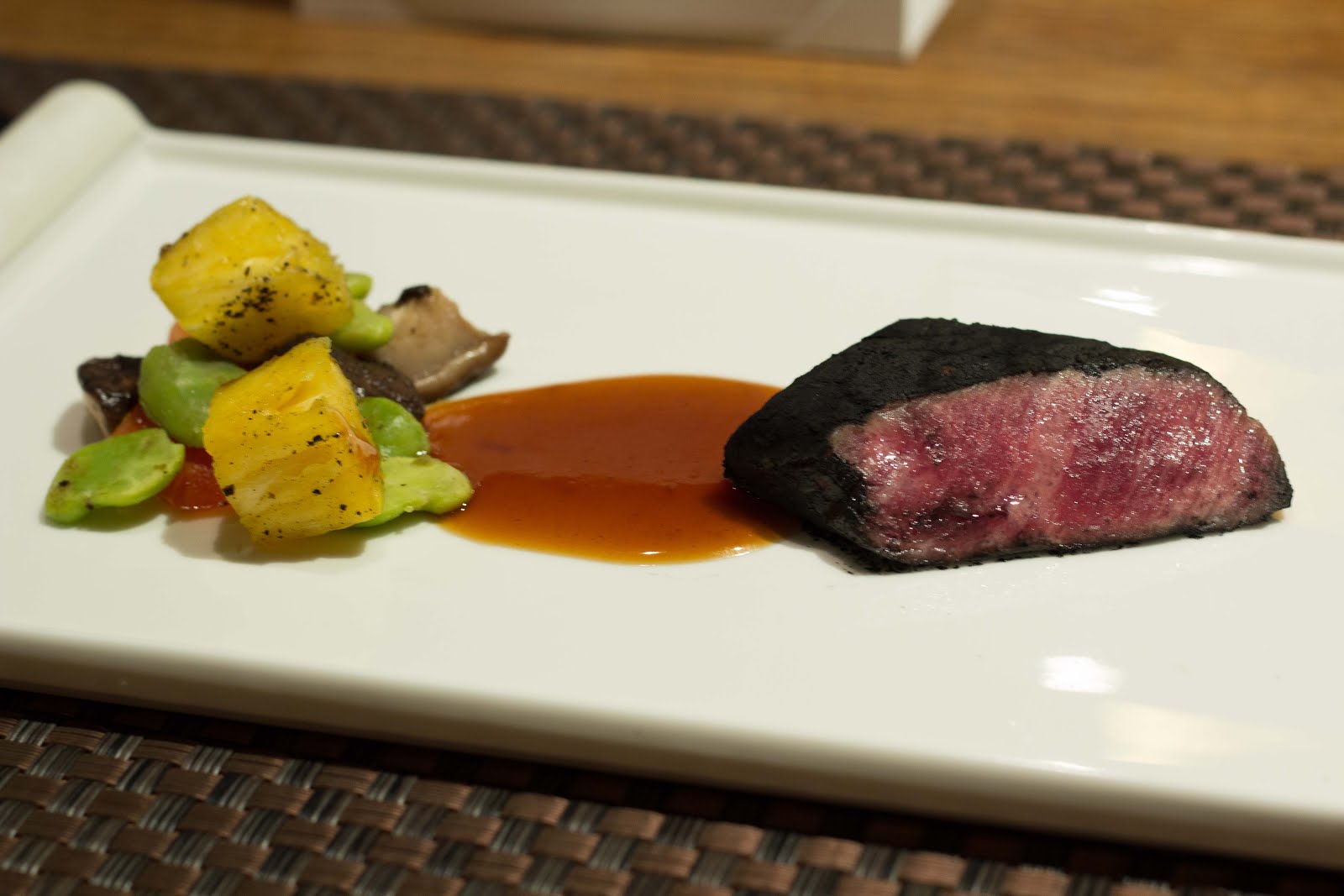 最为令我们惊艳的是这道牛肉料理了, Slow Cooked French Meltique Beef 。厨师选用的是特选A4/A5等级的澳洲和牛部位。或许有人也是和我一样,第一次听说 Meltique Beef,稍微上网查了一下下资料,发觉原来 Meltique 是一种特殊的处理手法,就是将 beef tallow (经过处理的牛脂肪) 置入牛肉里,目的是为了锁住牛肉的肉汁和味道。所以,这道牛肉吃起来细嫩无比,口感幼细到我都忘记了自己在吃着的是牛肉了,非常非常好吃!牛肉外层是炭 (charcoal),符合了现代人健康的饮食目标。虽然牛肉本身的味道就已经很丰富,足以让我们惊艳了,搭配上带点酸甜的酱汁又带出了另一种风味,让味道更上一层次,绝对大推!