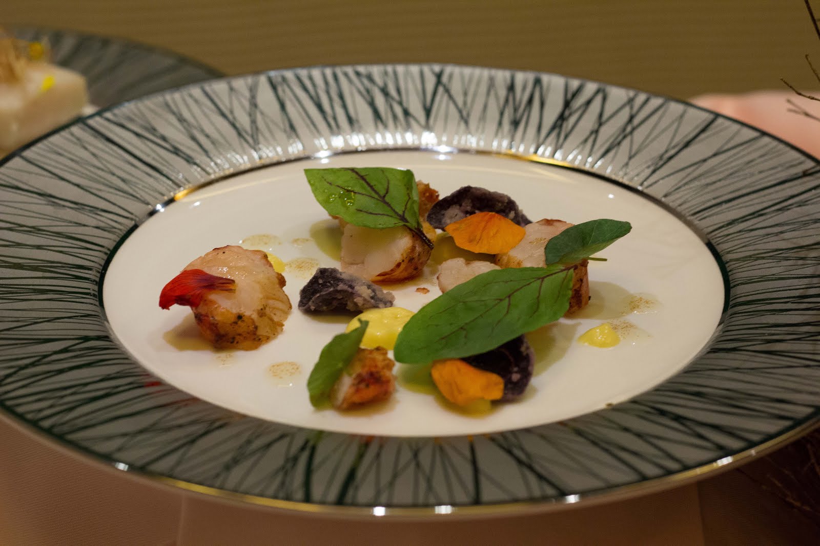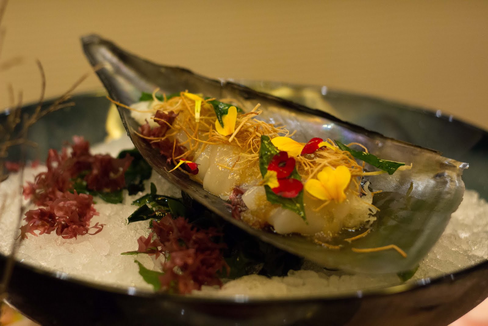 首先上桌的是, 火炙北海道带壳扇贝 。 火炙 北海道扇贝所搭配的酱汁是由紫海胆丝制成的。这是来自厨师的考量有些食客或许无法接受生海胆的味道,所以就把它煮进酱汁里,让食客可以体验海胆的鲜味。海胆制成的酱特别有鲜味,浓郁的来又和扇贝很搭。扇贝的新鲜度好,很大颗,搭配微咸的鱼子酱和海胆制成的酱汁,入口即化,幸福感爆灯!另外,覆盖在扇贝上的是烤小鱼片 (Tatami Iwashi),是一道用小沙丁鱼制作的前菜。Tatami Iwashi 香脆可口,很好的提升了整体口感。
