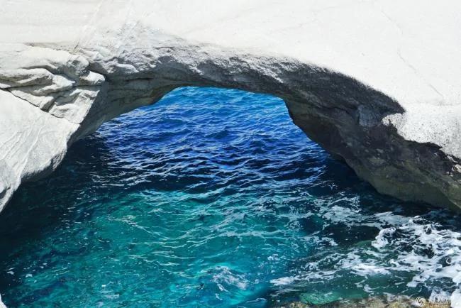 大自然似乎对米洛斯格外恩赐。米洛斯的Sarakiniko海滩被称为爱琴海海域的最佳图片拍摄景点,火山形成的亮白色岩石被海水雕琢成蔚为壮观的海蚀洞和时刻岩壁。在凹凸不平的岩石行走,宛如行走在月球表面,在周围蓝绿色海水的衬托下,如梦似幻。