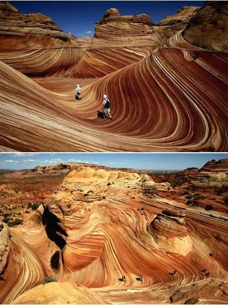 犹他州和亚利桑那州交界处的神秘石浪。(网络图片) 位于犹他州和亚利桑那州交界处的神秘石浪是由1.9亿年前的沙丘演变而成。在不到200平方米的山间缝隙中,血红的砂岩如海浪翻腾,刚和柔的奇妙结合令人叹为观止。顺着砂岩的纹路触摸着精致的波浪痕迹,仿佛还可以感受到亿万年前沙暴的精心设计和雕刻。