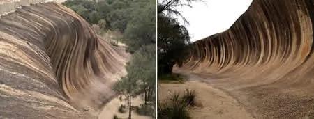 澳大利亚西部的波浪岩。(网络图片) 澳大利亚西部的波浪岩是天然岩层。由于它像高高的海浪因而得名。露出地面的部分占地几公顷,浪潮的部分岩石高约15米,长约110米。照片中显示的是罕见岩石墙。