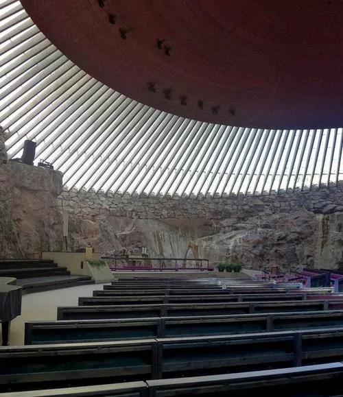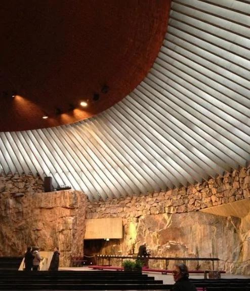 岩石教堂是世界上唯一一座建立在岩石中的教堂,外观彻底颠覆教堂的概念,看起来像着陆的飞碟,入口就像个隧道口。200多篇建筑杂志都对它不吝赞美。 与赫尔辛基其他教堂相比,它显得很低调——整体为半地下的结构,只有椭圆形教堂大厅沐浴在日光下。外部墙壁以铜片镶饰,内壁则完全保持了天然的花岗岩石壁纹理,芬兰人崇尚自然古朴的审美情感在此得到了充分体现。