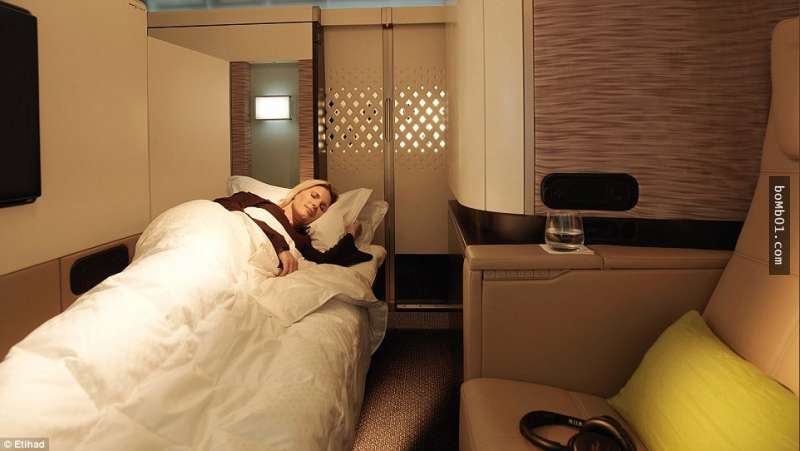 ▼1.阿提哈德航空:这间航空公司刚刚成立13年,服务水平却很高。头等舱内有210cm*25.4cm的床铺供客人休息,还有椅子和构成独立空间的门。宽敞的衣柜和浴室也加分不少。这里的餐点很有特色,一共有7道菜,还有品质很高的葡萄酒,坐在这里,你根本感觉不到身在九千英尺的高空。