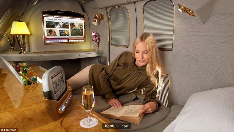 ▼3.阿联酋航空:平卧床丶独立空间门,这已经成为了标配。迷你吧台丶情景灯光给你最奢侈的享受。爱美的人可以尽情照镜子,还能调节情景灯光。宝格丽行动式旅行套装也很有吸引力。如果你乘坐的是A380机型,那太幸运了,因为上面有浴室丶水疗和酒吧。