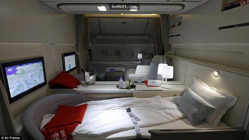 法国航空:这理由柔软的泡沫床垫丶休息室丶长椅。不想睡的话,酒吧和洗漱化妆包也能给你不少乐趣。