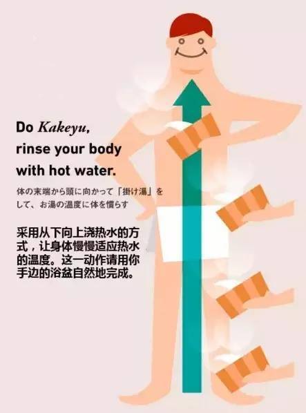 一般都会用旁边的盆装满热水,从下到上的淋湿身体,让身体慢慢适应热水的温度。