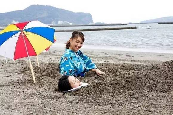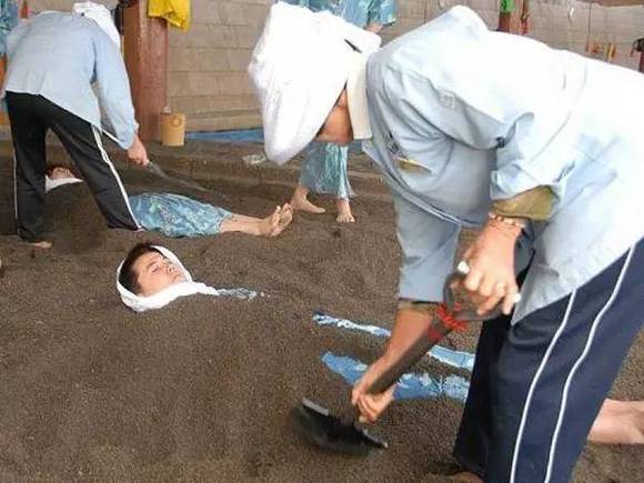 位于九州南部的鹿儿岛是日本最出名的温泉带之一,它有世界唯一的天然纱蒸温泉,“砂蒸”就是利用海底的温泉把砂石加热,然后将身体埋入受热了的砂土里,用砂的热量和重量去除疲劳,比直接泡温泉的效果好10倍。会馆里的工作人员会提前为你“量身定做”一个沙坑,身穿日式的浴衣,包好头巾,躺进沙坑,旁边的服务人员会根据你的需求用这里的温沙把你埋好,只剩脑袋露在外面,几分钟便可以感受到汗流浃背的爽快。