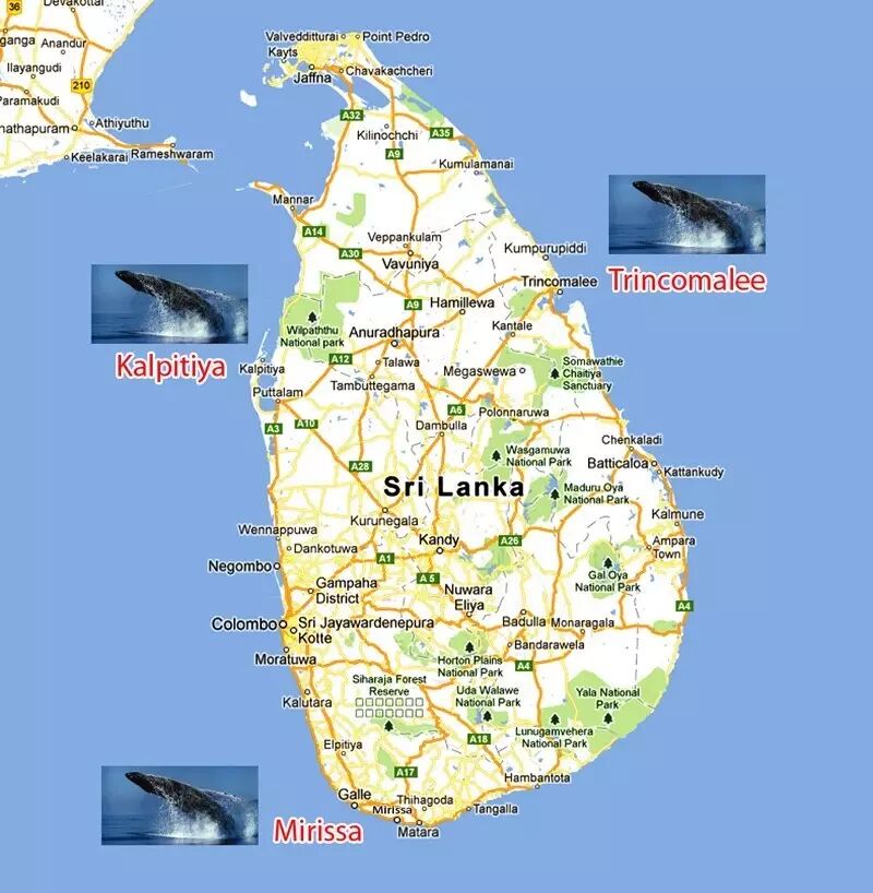在斯里兰卡,最容易看到鲸鱼的地方有三个,分别是西海岸的卡皮提亚(Kalpitiya),南海岸的加勒(Galle)和美蕊莎,以及东海岸的亭可马里(Tricomalee)。