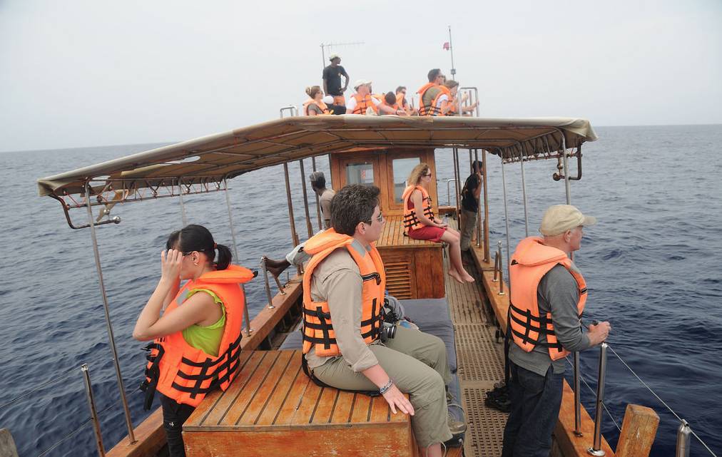观鲸船分为三种,分别是渔船,游船和军舰。在三种船之中,渔船最小,只能坐20-30人。由于船身太小,一点小的风浪就能让渔船晃得像个醉汉。只要不是常年出海的水手,一定会晕船。