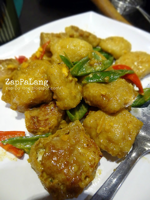 酿豆腐卜在裹上咸蛋黄酱之后,味道和口感又提升到另一个层次了。说不出到底酿豆腐卜里面用了什么肉,但是和咸蛋黄酱蛮搭的。