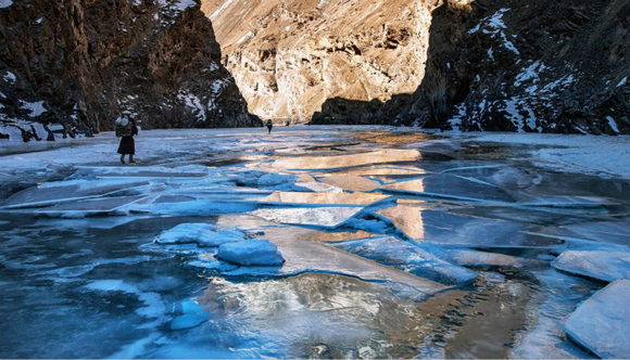 冰河徒步(位于拉达克):冰河徒步其实是因詹斯卡河结冰而形成的徒步路线。冬天,它连接了詹斯卡村和拉达克首府列城,被誉为世界上最疯狂的徒步路线。这条危险的徒步道路两旁环绕着惊艳的风景,有冰冻的瀑布和半冰冻的急流、洞穴。