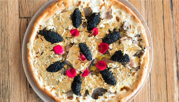 Industry Kitchen位于纽约曼哈顿南街海港,店内推出了一款售价高达2000美元的披萨,并且这个披萨基本上只有40口的分量,也就是说,你每咬一口就需要支付50美元。你将在这款披萨中吃到丰富的食材,用木火烘烤而成的薄皮披萨上铺了一层厚实的白色斯第尔顿干酪、鹅肝酱、法式松露、奥斯特拉鱼子酱,以及花瓣状的可食用金箔片。这款披萨于去年年底上市,你必须要提前两周预定才能吃到这道奢侈的菜品。为了帮助你削减开支,我们推荐你邀请四位好友,这样每个人只需花400美元就可以吃到一片披萨了。