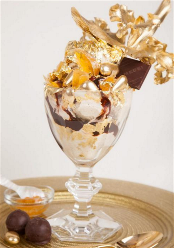 这道甜品是如此引人犯罪,它甚至有专属的维基百科词条。你需要至少提前48小时预约才能吃到黄金奢华圣代(Golden Opulence Sundae):售价1000美元的大溪地香草冰淇淋,其中加入了马达加斯加香草,用24K(可食用的)金箔覆盖,最顶上则是Amedei Porcelana巧克力糖浆和来自委内瑞拉的苏奥巧克力。在巴黎蜜饯水果、金黄杏仁、松露巧克力糖和杏仁饼的装饰下,圣代的造型也同样奢华出众,这一切都装在一个百家乐水晶杯里,你还可以将这个圣代打包回家。哦,对了,别忘了鱼子酱。购买这款圣诞还会赠送一碗美国金鱼子酱,顶上也点缀了许多金箔片,这两款组合在一起也算是物超所值。 如果你觉得这还不够奢华,今年这家餐厅又推出了一款售价25000美元的甜品。装盛这款“冰冻高级定制巧克力”(Frozen Haute Chocolate)的碗底放着一串镶嵌着白色钻石的黄金手链。Serendipity 3无比昂贵的甜品已经成了店铺的特色;店内还售卖世界上最昂贵的三明治——售价165英镑的烤奶酪三明治,面包在烘烤过程中涂抹了唐培里侬香槟和松露油。