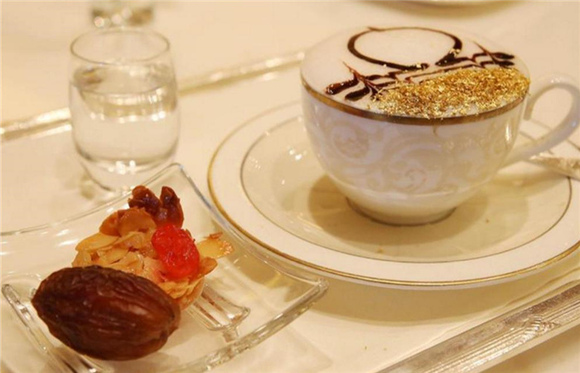 这是一杯分为三层的饮品,最上层是奶泡和24K金箔粉,中间是“味道浓郁醇香的顶级混合咖啡”,最下层则是上等的巧克力酱。饮品用高档的银器装盛,辅之以黑巧克力和枣椰子,因此显现出极其奢华考究的设计外观,它在Instagram上拥有超高的人气。同时,它的价格也并不是高得离谱,每杯售价60迪拉姆(约合人民币113元),加上服务费、旅游税和市政收费后,游客需要总共支付72迪拉姆(约合人民币135元)才能喝上这杯口感丰富的卡布奇诺。