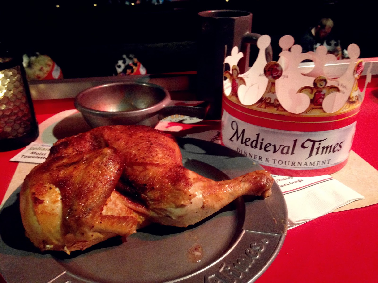 抵达中世纪城堡,人山人海的情景,我们就直接走到柜台处索取门票。这场晚餐秀我们免去了$62.95入场费用,所以一个人仅需付$25的晚餐费用。 一进门后,一身中世纪打扮的员工给我们分发每人一顶皇冠,然后主动要求帮我们合照。表演结束以后,你会在另一端看见你所拍的照片已经冲洗好了,喜欢的话可以购买。天下没有白吃的午餐,照片可不是免费的。 Li Sin 在途中告诉我们说道 “Medieval Times”,以前的人吃饭都没用餐具,叮咛我们做好心理准备用手吃晚餐,我们突然愣了真的假的? 员工带领我们到已分配好的座位,眼前的就是已摆设好的碗碟,果真就是不见刀具! 那么我们就入乡随俗好好享受当晚十一世纪国王的盛宴。 宴会会盛上番茄浓汤、大蒜面包、半只烤鸡、烤马铃薯、甜黍还有甜点和一杯饮品。 分量好大,那半只烤鸡我都已经饱到头顶,不想浪费剩余的食物所以决定打包回家当明早的早餐。 一边享用我们的晚宴一边目睹六位骑士之间的对决。忘了提及这一点,当我们就坐在分配好的桌位时,就代表着我们是其中一名骑士的后备团,无时无刻为骑士加油给予力量! 现场惊险刺激的竞技比赛,剑斗表演,马术和训鹰表演赢得宾客们的喝彩欢呼。