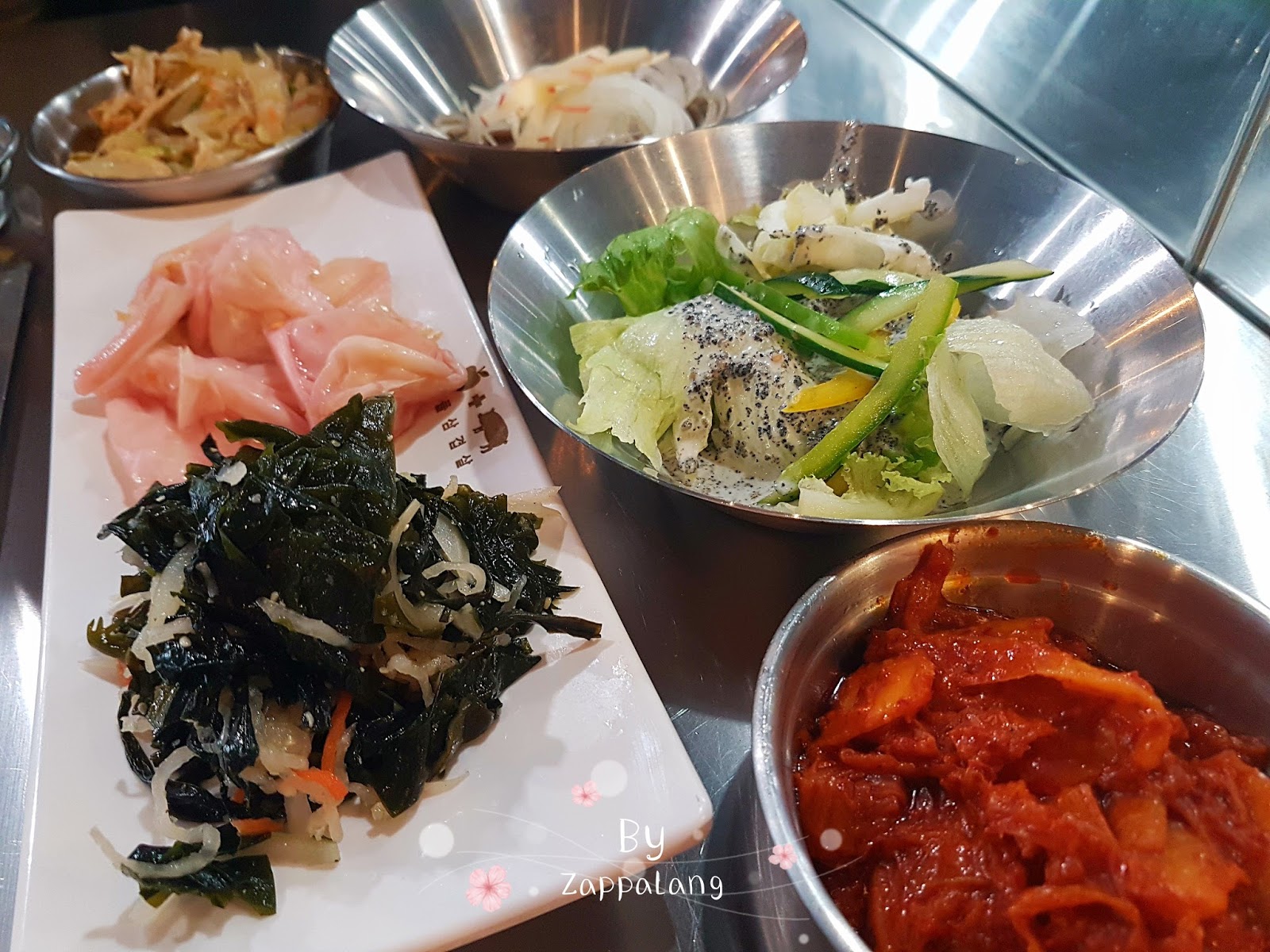 先说小菜,来吃烤肉怎么少得了小菜?除了炒鱼糕, 苹果沙拉和 拌海带 适合就这样吃以外,其他的小菜都偏酸,我想这是为了中和 烤肉的油腻而特地调味成这样的。我尤其喜欢苹果沙拉的拌酱,清爽的沙拉菜和加了黑芝麻的酱料很搭,虽然我不知道这算不算是韩国料理不过味道不错。
