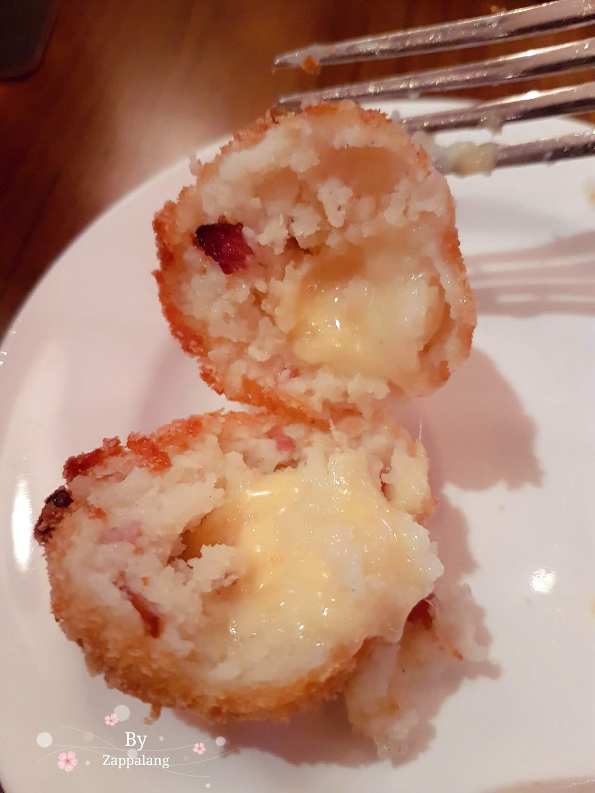 我一向不爱吃芝士,不过朋友一直跟我极力推荐这个所以我就点来试看,没想到还真的不错吃,切开炸得金黄的圆球, 包裹着芝士心的是加了培根碎的马铃薯泥,芝士没有我讨厌的味道,不过马铃薯泥是用了搅拌器过度搅拌过,口感太过黏稠这点是败笔。