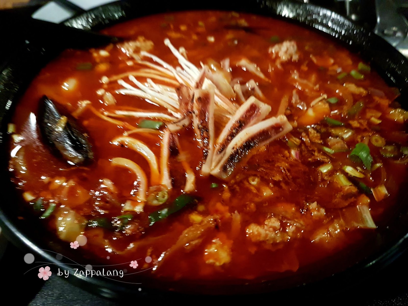 在韩国说到面食,除了拉面,炸酱面,接下来应该就是这个Jjampong 了。所谓的Jjampong其实就是加了辣椒粉的海鲜面,这里的版本分成超辣和普通辣,我不敢冒险所以点了普通辣,当店员端了这碗来的时候我还以为来到了四川餐厅,整个红到不行,味道闻起来也很呛辣