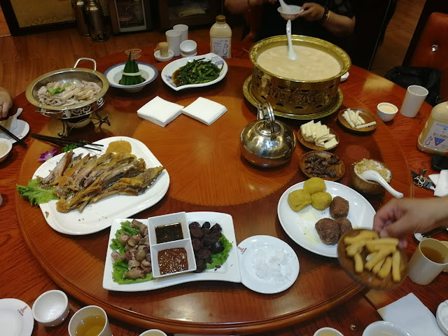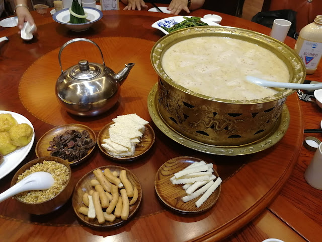 图里所示左边的是奶食,而右边的是锅茶。奶食,顾名思义,就是奶制品,都是奶制成的各类食品,各具特色。欧巴个人喜欢中间那个饼干,很有牛油香。这些奶食都是放进锅茶里泡着吃,不然只是这样吃的话会太硬,比较难咬。锅茶是蒙古族传统奶茶,由牛奶和茶制成,而且上面还有奶皮,很香。特别的是,内蒙的奶茶都是咸味的,有别于马来西亚常见的甜奶茶,别有一番风味。锅茶、奶食、和手把肉,这三件套称为硬早餐,是蒙古族吃了之后,可以一直撑到晚上再进食的。