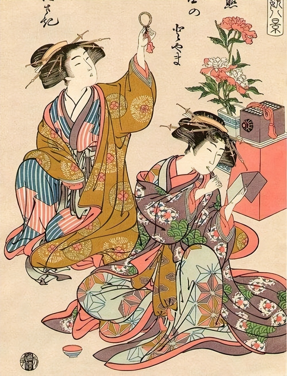 这个结法实用,漂亮,不容易散,很快从芸者圈传到了普通女性。到了明治年间,和服整套着装系统趋于标准化,带枕、带扬、带缔三件配合使用,成了不可缺少的组合。
