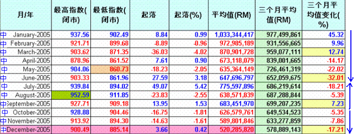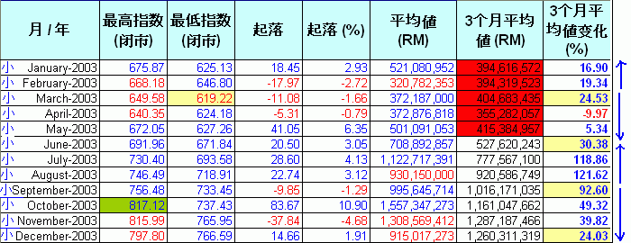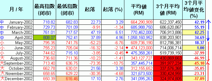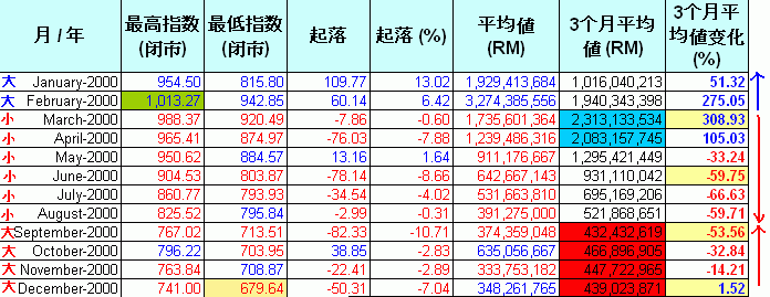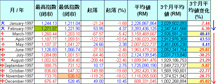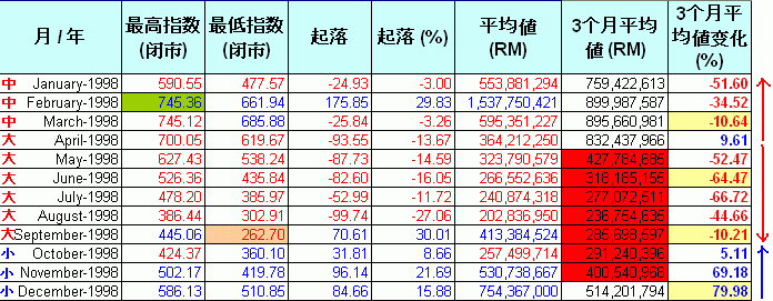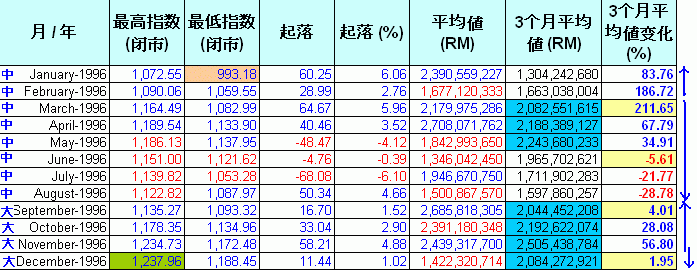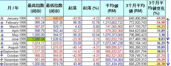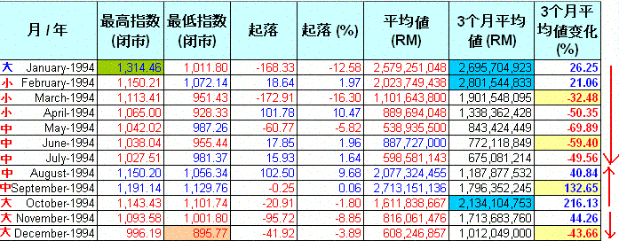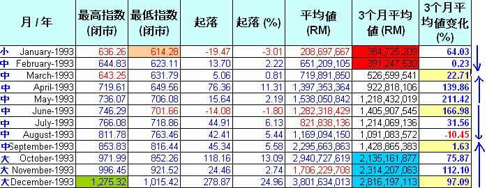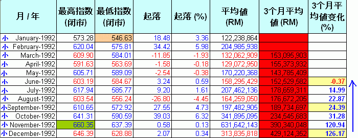 现在让我们逐一分析每年的数据.这些图表里.指数的"起落"是根据上个月最后一天的指数和当月最后一天指数的差距."平均值(RM)"是当月的平均成交值."3个月平均值(RM)"是计算每3个月的平均成交值.红色highlight的是平均值少过5亿,而蓝色的highlight表示超过20亿."3个月平均值变化%"是最重要的一环,它是对比当月的3个月平均值和前3个月的平均值.例如,1992年6月的“3个月平均值”是152M,对比前3个月,也就是1992年3月,其“3个月平均值”是153M,下挫了 0.37%.从它的上升和下挫,我们可以预测指数将进入调整期和沸点及冰点.