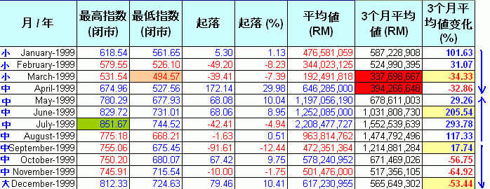 99年的牛也很有规律的成长,都通过两次的调整变成大牛.可要注意的一点是,3月和四月的"3个月平均值"突降到5亿以下,熊来了吗?这时有几点帮到我们,第一是指数3个月理论,低点是3月的494.57,而4月的指数已超越它了.第二是刚诞生的小牛少机会在六个月内夭折(目前为止牛的寿命最少1年).第三是"3个月平均值"通常是低过5亿几个月才能称做大熊.以上的数据证明了那段时期是较大的调整期.