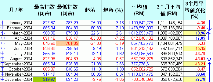 知道了处于牛或熊市后,股友们最头痛的是不能准确预测沸点和冰点.根据8k前辈的3个月理论,如果单看指数是不足够,最重要的是成交值(RM),还是要看每隔3个月的平均值变化%,它预测的机率达60%以上.