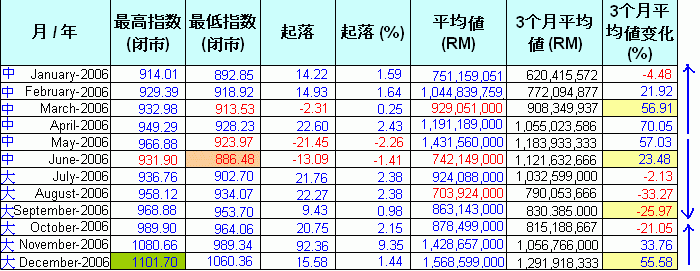来到2006年,平均值和指数的上升让我们肯定了去年尾的大调整.可又当我们以为它会升级成大牛的时候,再次耍脾气(玩嘢)的这只长寿牛又在5月的966点调整到6月的886点.而接下来几个月的平均值变化%呈下降是显示当时的调整.所以呢,这只长寿牛是否长命呢?当群众以为指数在11月破千点才认定是牛来了的时候,其实它已经是一只(玩嘢的)老中牛了.我之所以分析它是只老中牛是因为这4年来它的"3个月平均值"不曾跌过5亿和上到20亿,它总共经历了6次的大小调整.