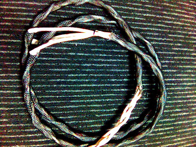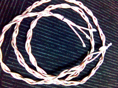 首先先缠电线,用了忘了是什么名的方法,就是以地线为主轴,然后正负线沿着主轴相互缠绕,为免缠到后面忘了什么线是什么线,先在线上做了记号。他x的,八号线粗到要死,缠到偶气喘吁吁。