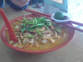 Sarawak Laksa, 顾名思义,就是 Sarawak style 的Laksa,味道跟西马的不同,有甚么不同呢 ? 呃。。,说不出那里不同,只可以说,用的材料和煮法不同吧 ! 还有,它椰浆味很浓 (当然,一些奸商下手不重,淡了些。。。),和带有少许虾酱的味道。。好吃不好吃呢,那就看各人的喜好了,我就说好吃啦。。。尤其是 Laksa 面。。。其实原来的配搭是 Laksa + 米粉(米粉要是那种粗于普通米粉但又细过濑粉的),但个人就比较喜欢 Laksa + 面,而这面呢,就一定要是 Kampua 的面,我还是不能接受搭黄面的。。。。。