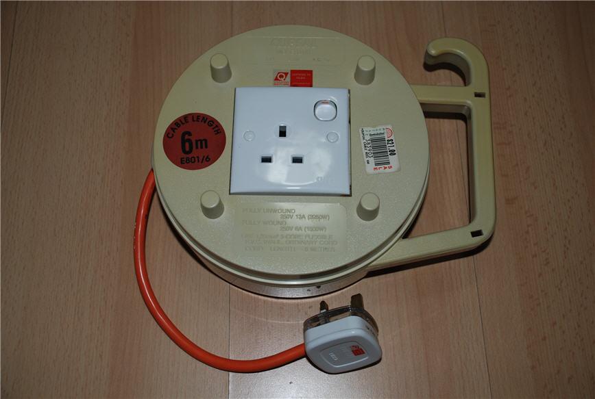 这个卷盘式的CLIPSAL牌子的延长线,电线有6M,完全卷入圆盘内,就是所谓的Fully wound ,即是这个电线的热量会增加,过热,所以它的承载量就下降了,只能使用高达1500W的电器。