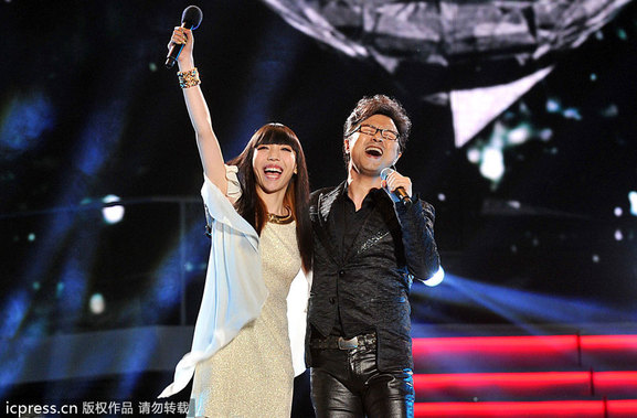 2012年9月30日,上海,2012《中国好声音》总决赛举行。吉克隽逸、吴莫愁、梁博、金志文经过最后全力拼搏后,最终梁博以压倒式的呼声获得“2012年度好声音”称号。图为吴莫愁、汪峰。