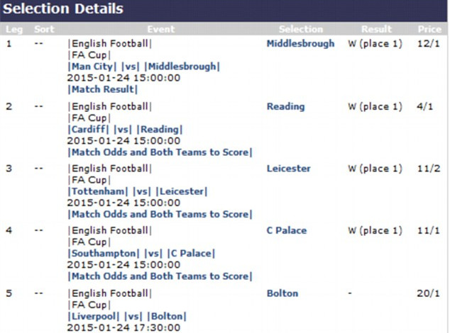 令人惊讶不已的是,随着水晶宫3-2击败南安普顿、曼城0-2不敌米堡、热刺1-2负于莱斯特城,以及雷丁2-1击败加的夫,他所投注的前4场比赛全部正确,如果在稍晚进行的利物浦与英冠球队博尔顿的比赛中红军输球,那么他就将获得100万英镑的巨奖。