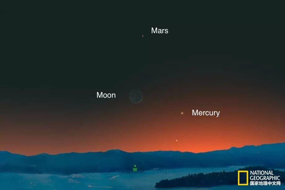 插图:ANDREW FAZEKAS, SKYSAFARI日落之后,观星者们可以望向西方的天空,看一钩新月与右下方的水星和上方的火星形成一个壮观的天空大三角。除了这可爱的形状之外,还有一个理由就是,这个形状可以让观星者看到水星在夜空中最亮、最高的样子。