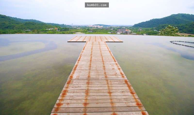 这是一间水上餐厅,沿著水上木步道走到前头眺望宜兰风光,非常惬意。清澈水面上还有小巧思,用石头堆叠出“双心沪石”图案与“I love you”字样排列在一起,非常浪漫。从二楼还能看到更远处的美景。