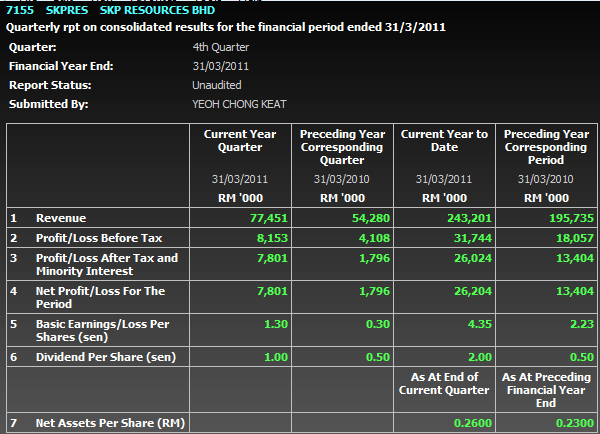 或许你会认为制造这些产品会赚钱吗,答案已从他的盈利上面得到了肯定,星光资源(SKPRES-7155)一直都保持着盈利增长,在截止31-03-2011财政年的全年营业额达到了2亿4320万1000令吉,比往年同期的1亿9975万2000令吉增加了21.75%,盈利更从去年的1247万9000令吉狂增了110%至2620万4000令吉。而去年公司也破天荒地分发了高达每股2仙的股息,如果以目前的闭市价每股RM0.275来计算,周息率高达7.28%,虽然不清楚即将来临的星光资源(SKPRES-7155)会否保持着去年的同样派息率,但星光资源(SKPRES-7155)是肯定有派息,只是不懂多少。而且星光资源(SKPRES-7155)每次的派息都是无须扣TAX25%。