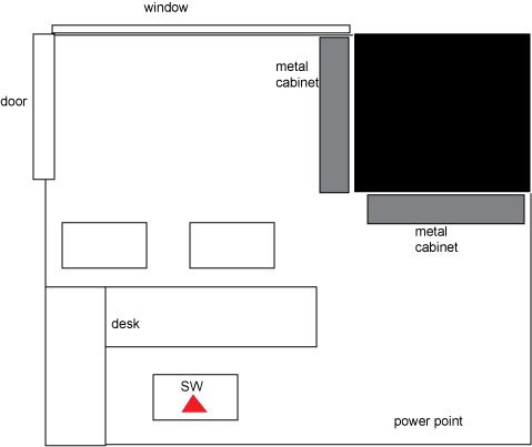 现在的位置面向西南(窗口),写字台呈L型,靠左侧的墙,墙外是走道。左侧的墙和背后的墙是间隔板
